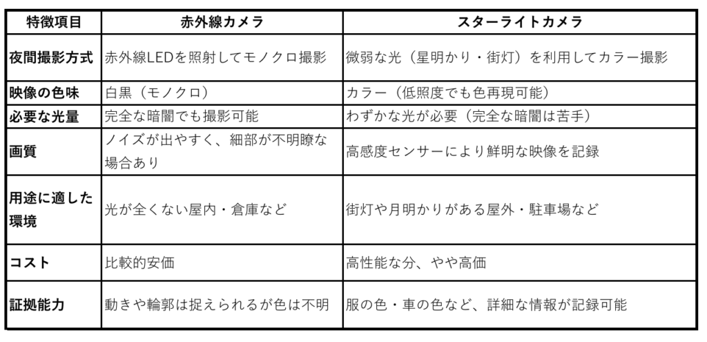 ・スターライトカメラは「低照度カラー撮影」に特化しており、夜間でも色を識別できるため、犯罪捜査や証拠映像に強みがあります。